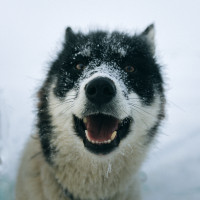 black markings around its eyes and ears, indicative of the breed characteristics. The dog seems to be enjoying itself, possibly after playtime in the snow.