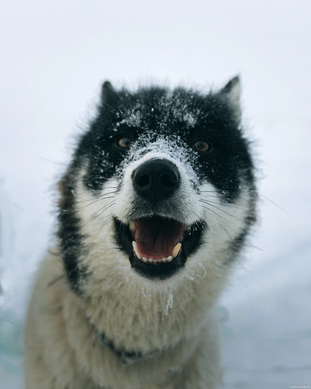 heavy snowfall or has been in the snow for some time. The dog's fur and face are white with distinctive