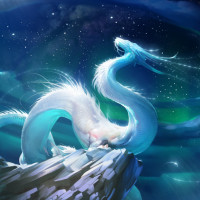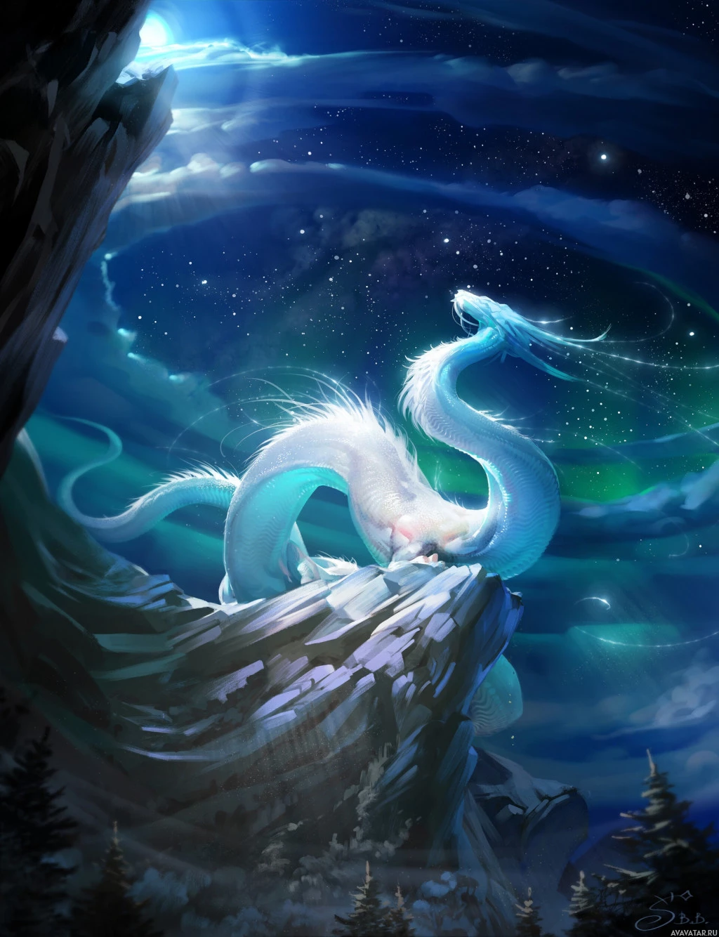 a night sky with stars and a full moon, giving the impression that it's either dusk or dawn. The dragon is sitting on