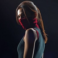 a dark top, jeans, and gloves, and have a mask covering their lower face. The individual is standing with one hand on their hip and looking off to the side with