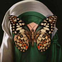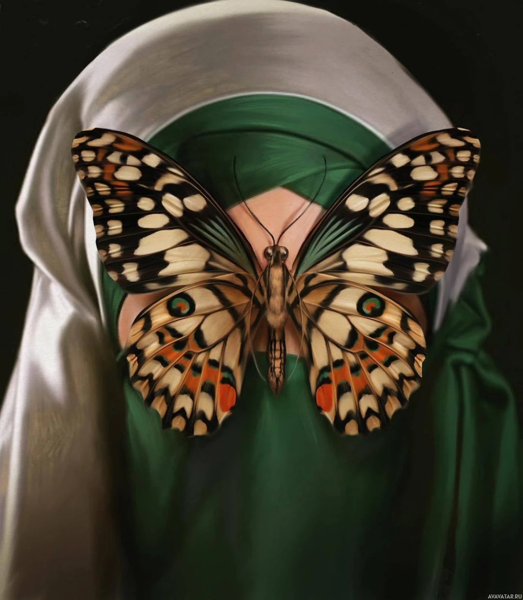 colorful butterfly is resting on the person's nose, which is an unusual and somewhat surreal detail. This combination of elements creates a unique and intriguing visual composition that blends human features with those of an animal, emphasizing