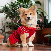 a small dog wearing a red and white striped sweater. The dog appears to be a breed with long, shaggy fur and pointed ears, which might suggest it is a breed like the Shetland Sheepdog or a similar breed known for its