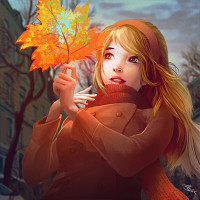 На картинке изображена молодая женщина со светлыми волосами, держащая в руке осенний лист. Она носит коричневое пальто и шарф, предполагая, что это может быть холодная погода или осенний сезон. На заднем плане также есть тёплый уличный фонарь. Общая атмосфера картины передает ощущение уюта и красоты осеннего сезона.