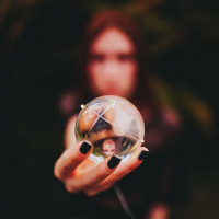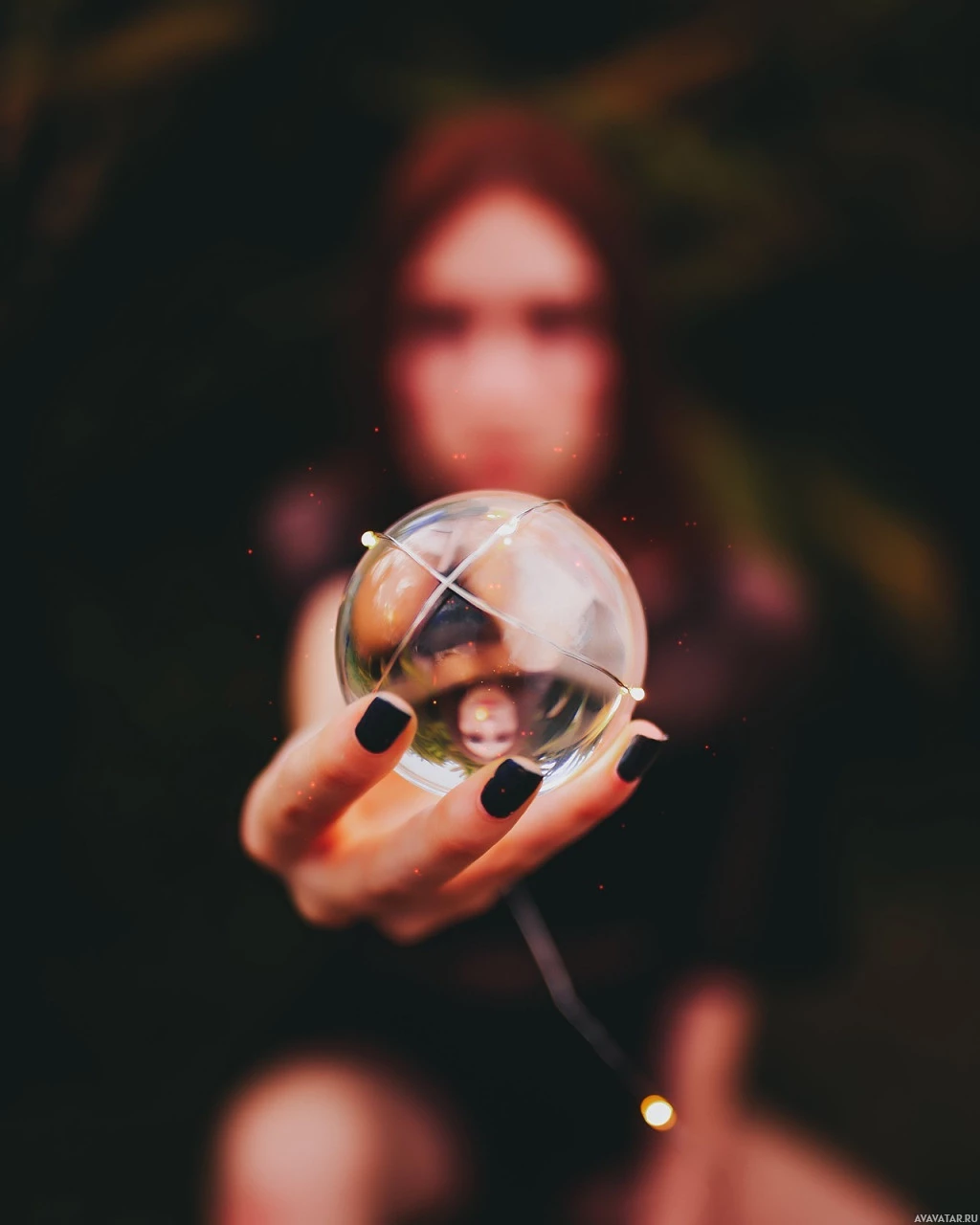 На снимке изображена молодая женщина, держащая стеклянный шар. Она, кажется, фокусируется на шаре, который имеет какое-то магическое или мистическое качество, возможно, связанное с гаданием или магией. Обстановка, кажется, находится на открытом воздухе ночью, и есть слабые огни, которые придают изображению эфирную атмосферу. Женщина носит черный верх и ее волосы стилизованы в прическу.