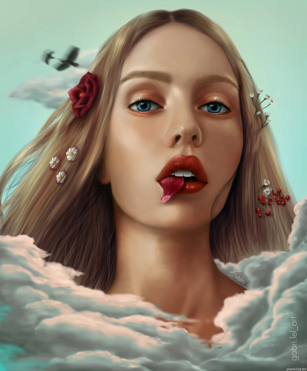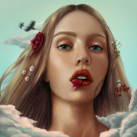 blue eyes and is wearing red lipstick, which adds to the intensity of her expression. There are floating cherries near her face, possibly symbolizing beauty or temptation. The background features clouds that add to the ethereal quality of the image. The overall aesthetic of the picture is dreamy and artistic.