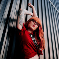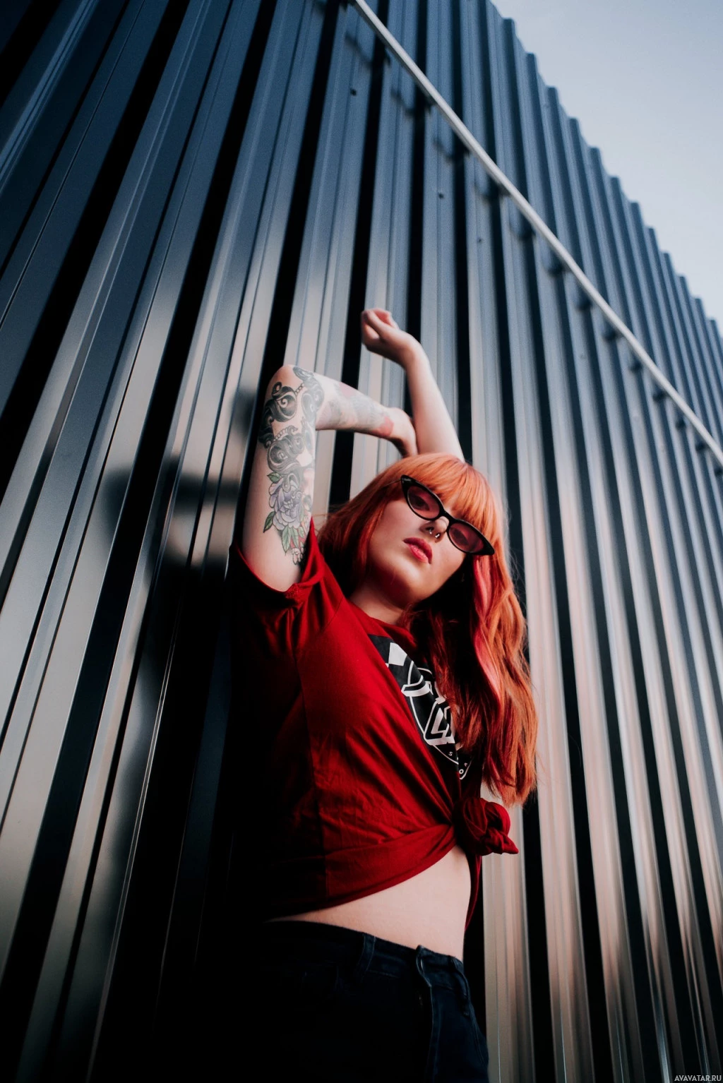 red hair leaning against a wall. She is wearing glasses, a dark-colored shirt, and jeans. The background appears to be an industrial or modern building, as suggested by the corrugated metal panel and