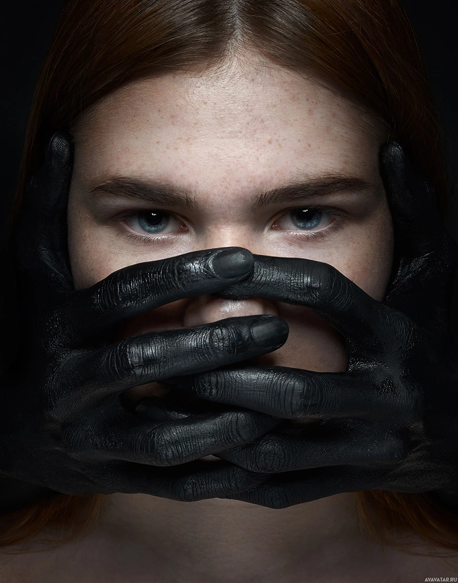 black gloves on her hands, which adds a striking visual element to the photo. There is also a monochromatic color scheme present in the image, with the person's face rendered in grayscale tones while the rest of the photograph is in