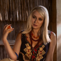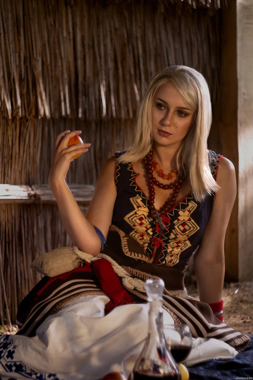 sort of activity, perhaps related to the game "The Witcher." Her expression is serious, and she is dressed in attire that could suggest she is cosplaying as