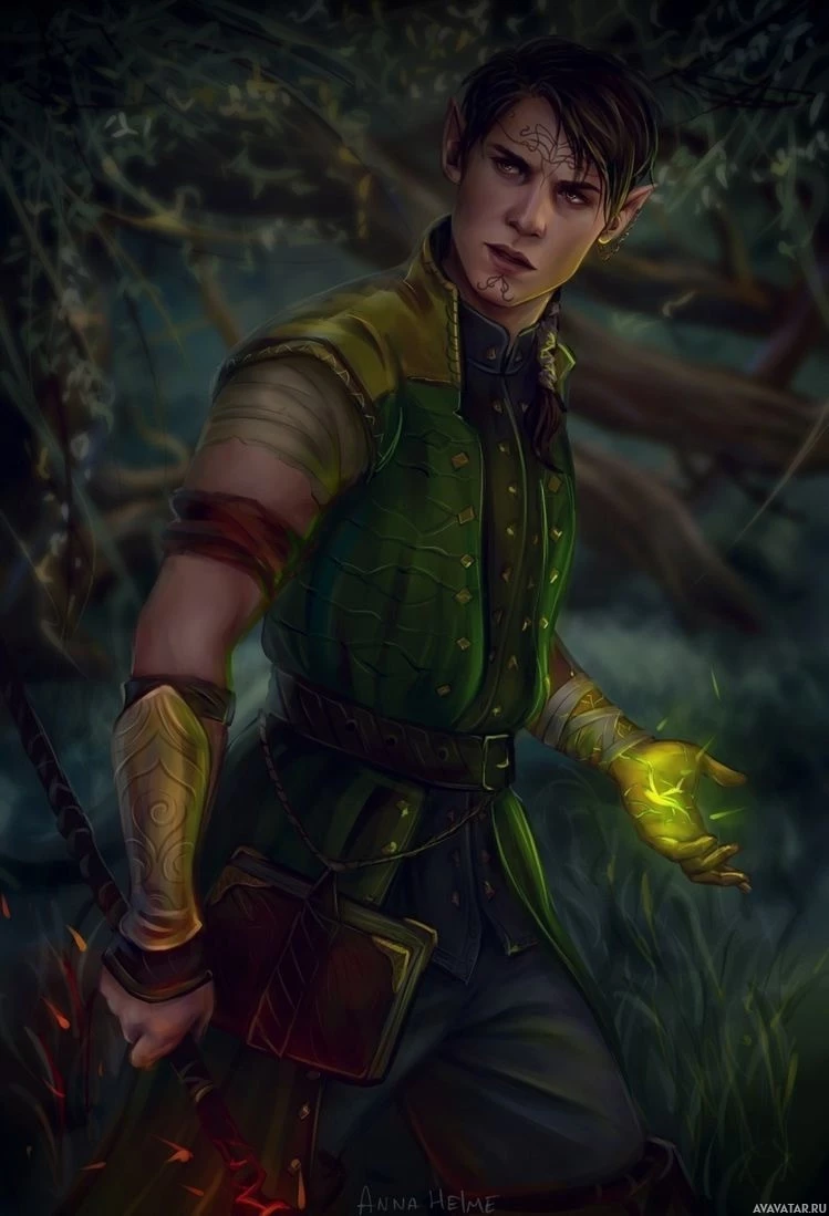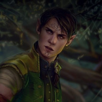 a fantasy character, a young male with pointed ears, who appears to be an elf. He is dressed in green and brown armor or clothing, which could suggest he is from a forest-dwelling or wilderness setting within