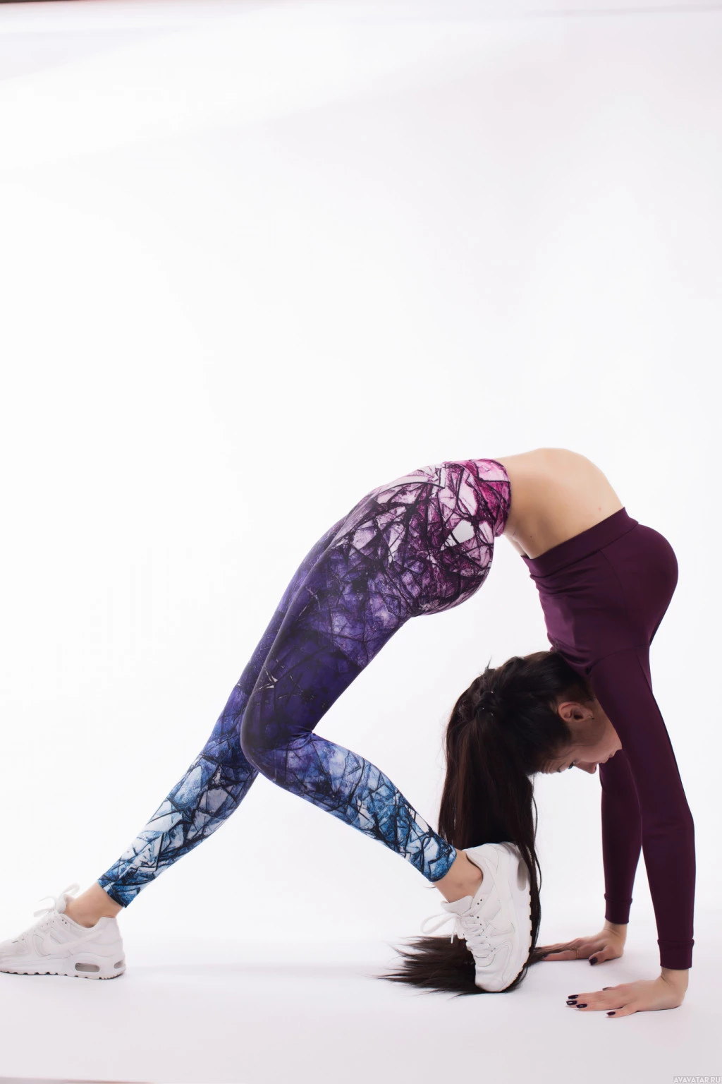 На картинке изображен человек, выполняющий передний изгиб, который является распространенным упражнением на растяжку, часто используемым в йоге или как способ снять напряжение в спине и шее. Человек, по-видимому, носит активную одежду, которая включает в себя верхнюю часть и леггинсы с цветочным рисунком.