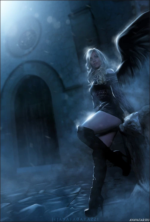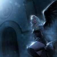 The image depicts a fantasy-themed character, often referred to as an angel, standing in what appears to be an eerie or magical setting. The character has wings and is dressed in