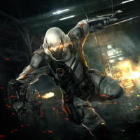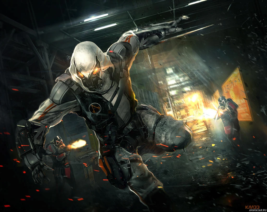 a chaotic scene. The character is also wearing a helmet that covers their eyes, adding to the mysterious and intense atmosphere of the image.