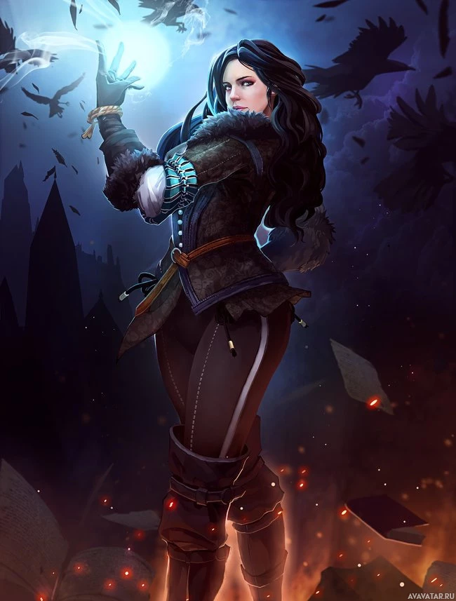 a glowing orb in her right hand, which is a common magical item used by characters within the game. The background suggests