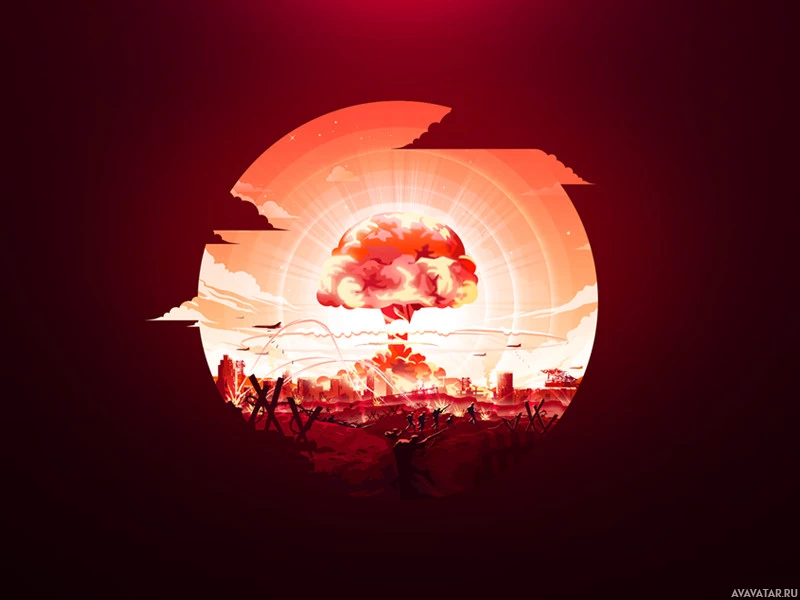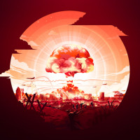 a nuclear explosion at sunset or sunrise. The central figure appears to be a stylized bomb, which is set against the backdrop of a bright