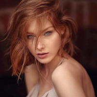 На снимке изображена женщина с рыжими волосами, которая смотрит прямо в камеру. Она, кажется, в помещении, возможно, перед кирпичной стеной или на аналогичном фоне. Освещение дает ей мягкое свечение, подчеркивая ее особенности. Она носит то, что выглядит как текстурированный верх и имеет нейтральное выражение на лице.
