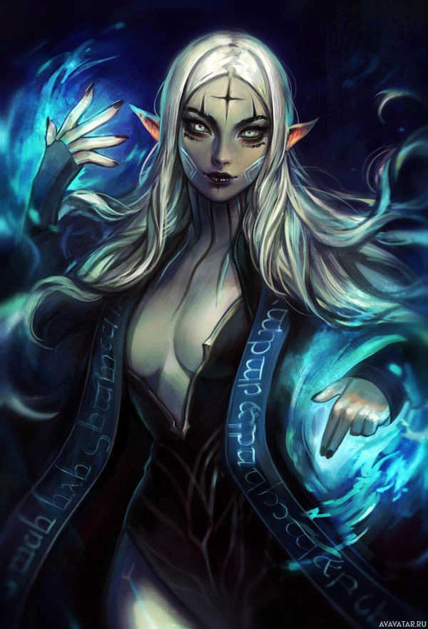 white hair. She is wearing a black and blue outfit, which could be interpreted as a form of armor or attire typical for elves in