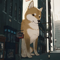 The image features an illustration of a giant Shiba Inu dog standing on a street. The scene includes buildings, possibly indicating an urban environment. There are signs and advertisements visible, suggesting a commercial area or cityscape.