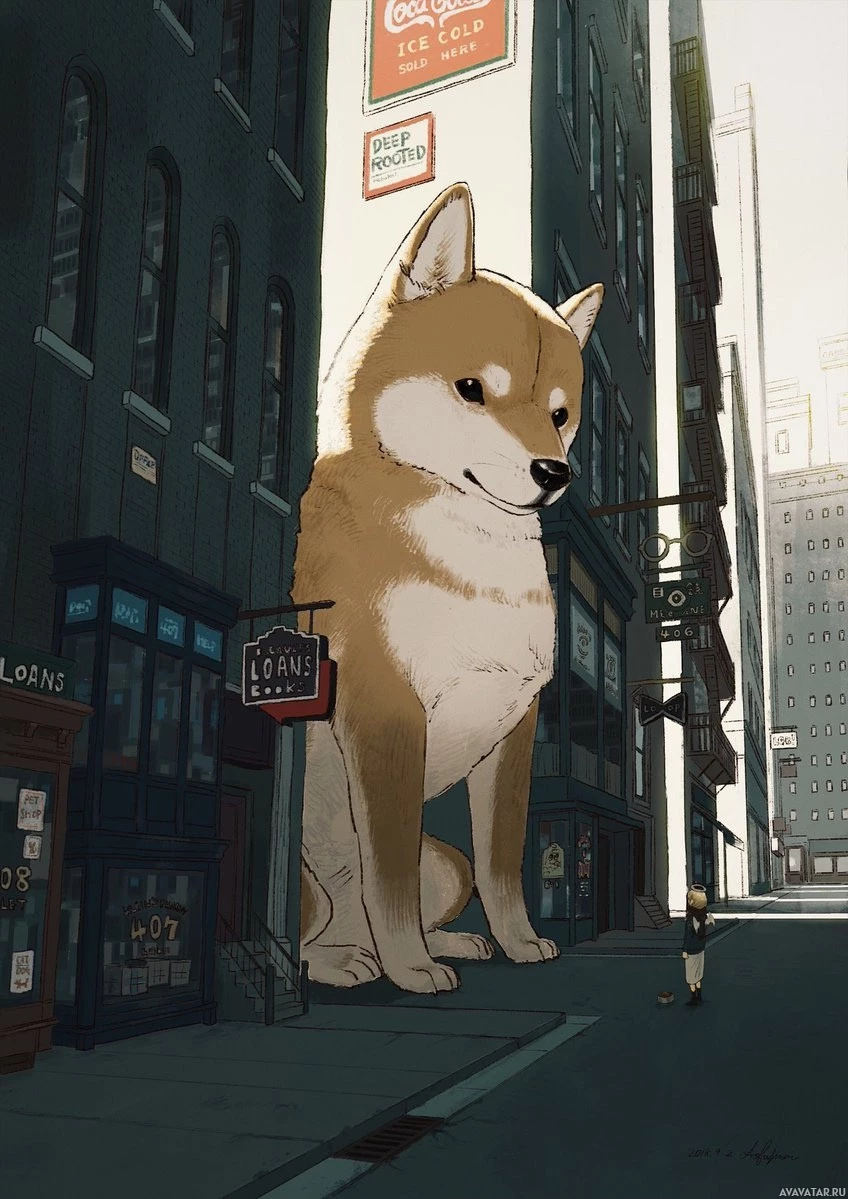 На картинке изображена гигантская собака Шиба Ину, стоящая на улице. Сцена включает в себя здания, возможно, указывающие на городскую среду. Видны знаки и рекламные объявления, указывающие на коммерческую зону или городской пейзаж.