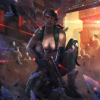 a crouched position with her weapon at the ready. Surrounding her are various elements indicative of combat or action, such as explosions and debris flying through the air. The style suggests it may be a promotional image for the game.
