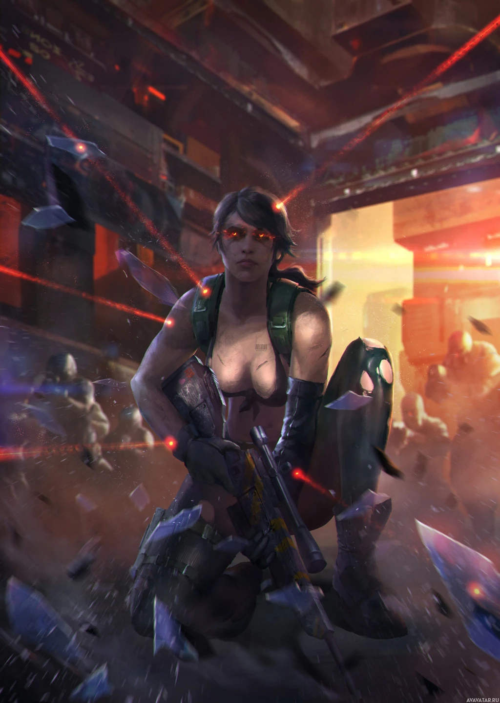 the video game "Metal Gear Solid V: The Phantom Pain." She is depicted sitting in