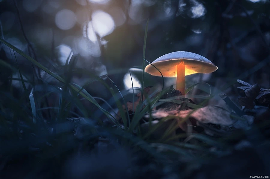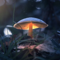 The image shows a mushroom in the foreground, which appears to be lit up. It's sitting on what looks like a leafy plant, with
