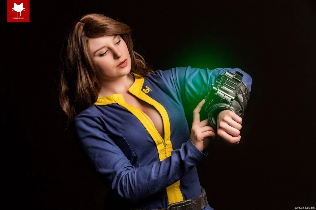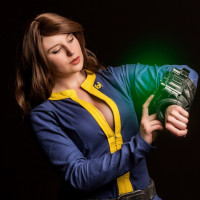 The image shows a woman dressed in a costume that resembles the outfit of a character from the "Fallout"