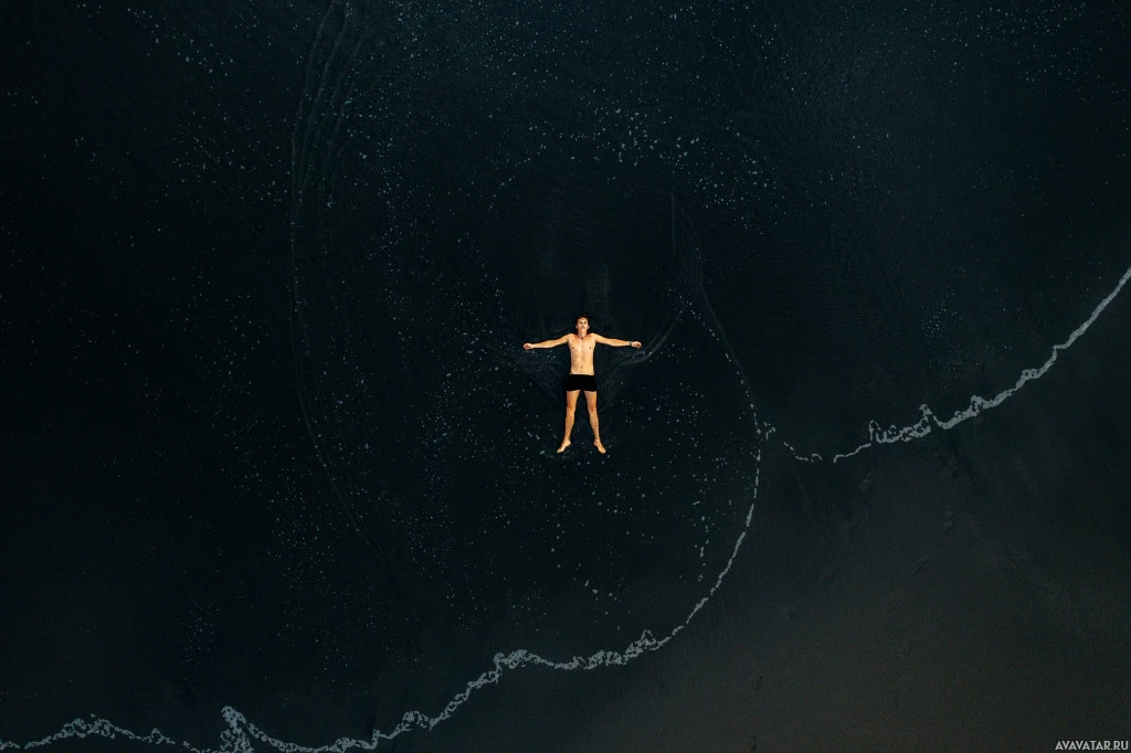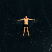 dark shorts or swim trunks and has their arms outstretched as if they are either paddling or performing a stroke in the water. There's