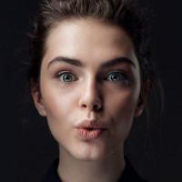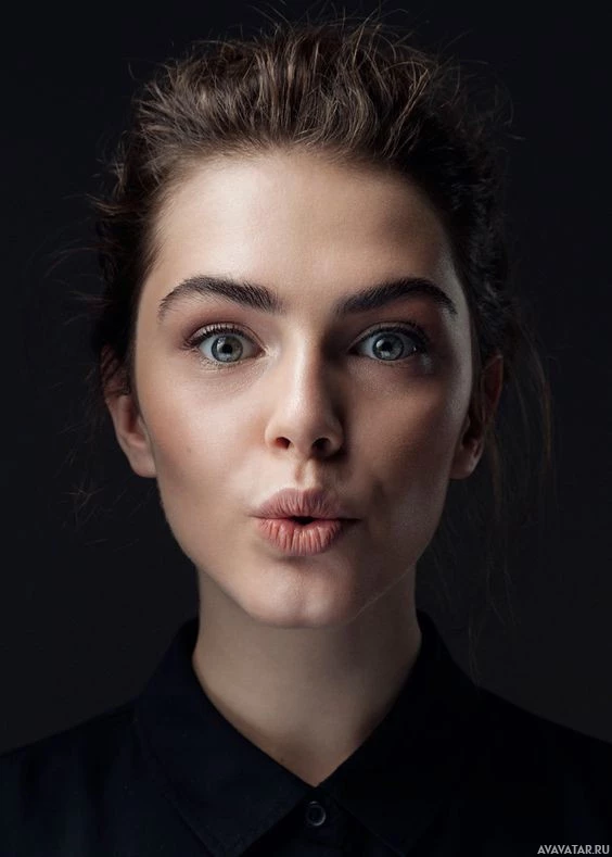 short hair and is wearing what appears to be a dark top. Her expression is somewhat quirky or surprised, which could suggest that she's either being playful or reacting to something unexpected.