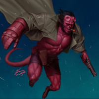 The image features a character known as Hellboy, depicted in