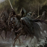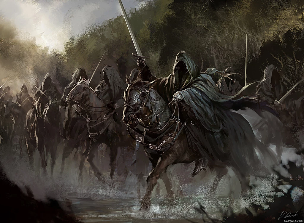 The image depicts a scene from Middle-earth, specifically with characters that appear to be Nazgûl. These figures are riding horses and are dressed in