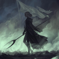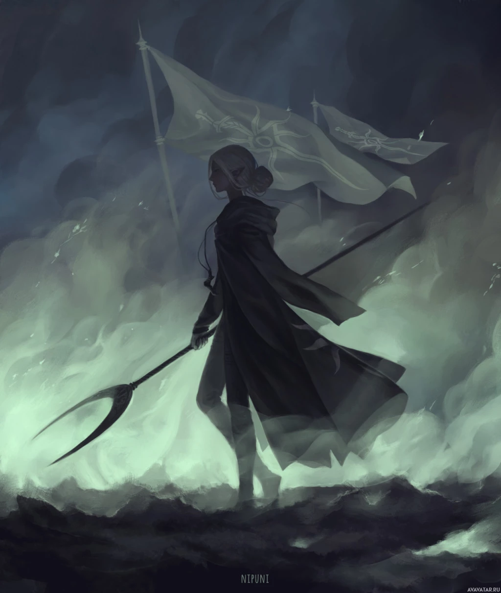 a fantasy setting. The elf is holding two flags that seem to be waving against the wind, suggesting motion or a breeze. The elf is also wearing a cloak and carrying what looks like a weapon, possibly a spear or a staff, adding to the heroic or adventurous theme of the image. The background has