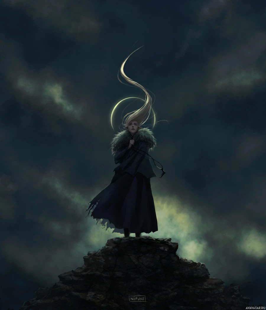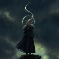 the stormy sky behind them. The overall mood of the image is quite somber, evoking a feeling of being lost in thought or perhaps facing an impending challenge or danger.