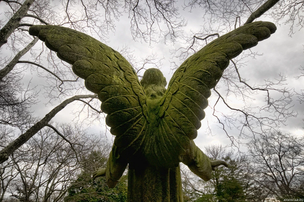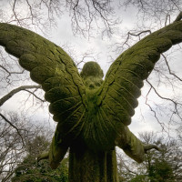 an angelic figure with one wing extended. The statue is made from what appears to be stone or a similar material, and it's situated in what could be a park or garden setting, as evidenced by