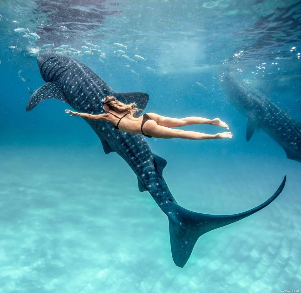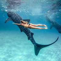 whale sharks visible in the background. The water is clear, indicating shallow depths, which suggests this scene might be taking place at a location known for such encounters with these