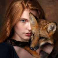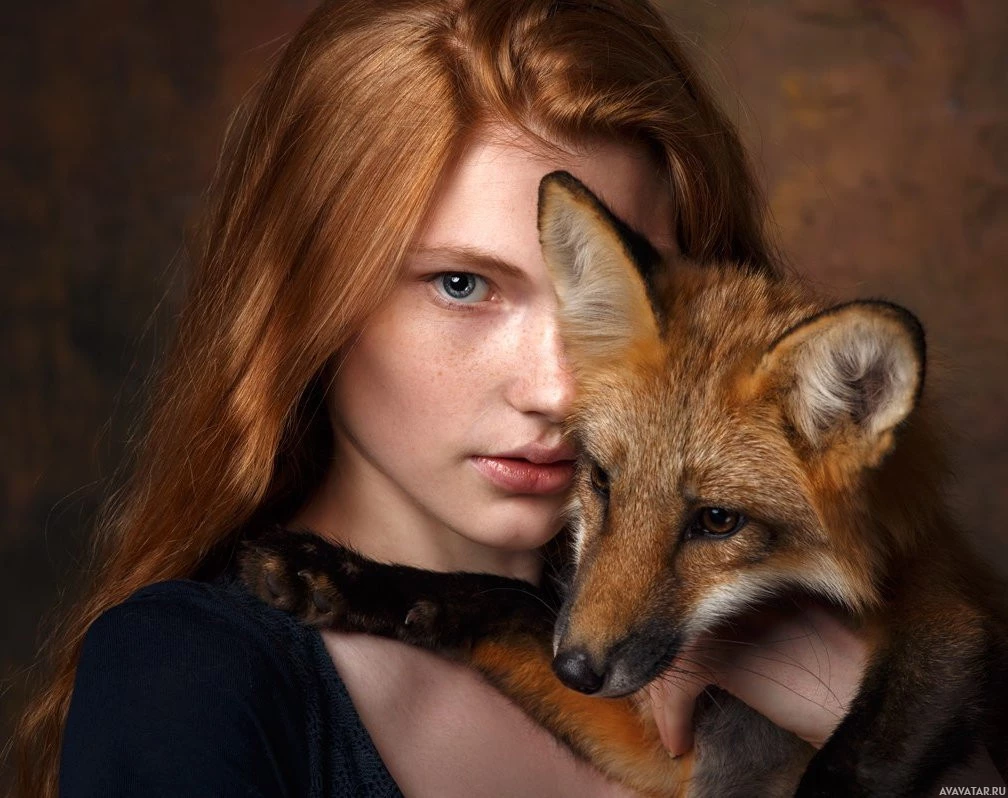 На снимке изображена женщина с рыжими волосами, держащая лису. Она смотрит прямо в камеру со спокойным выражением лица. Лиса кажется довольно маленьким, вероятно, молодым животным. Они сидят вместе в том, что кажется внутренней обстановкой с теплым освещением. В этой сцене запечатлен момент связи между людьми и животными.