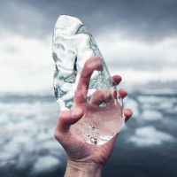 The image features a human hand gently holding a large piece of clear, translucent ice. The background suggests that the photo is taken near a body of water with floating ice chips visible on its surface, indicating cold temperatures or an icy environment.