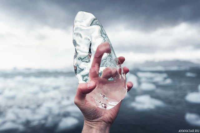 На картинке изображена человеческая рука, мягко держащая большой кусок прозрачного полупрозрачного льда. Фон предполагает, что фотография сделана вблизи водоема с плавающими ледяными щепками, видимыми на его поверхности, что указывает на холодные температуры или ледяную среду.