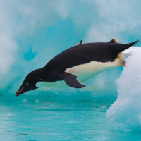 The image shows a penguin jumping into the water. It appears to be in an aquatic environment, possibly an enclosure or