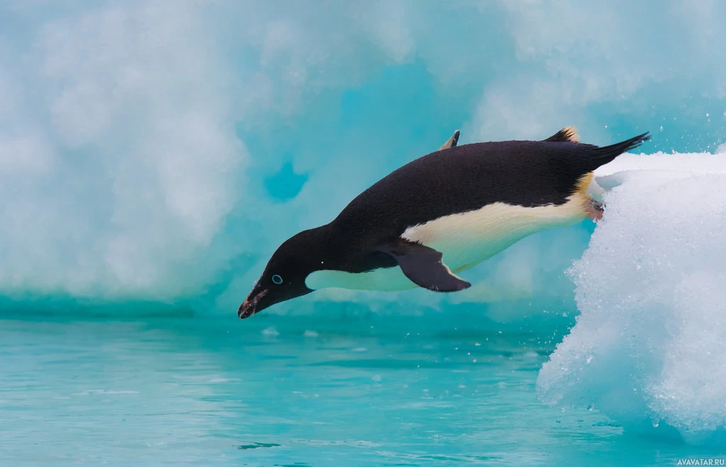 a natural setting with ice floes and clear blue waters. The penguin is a distinct black-and-