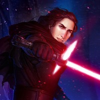 The image features an illustration of Kylo Ren from the Star Wars franchise. He is depicted with his lightsaber drawn, ready for action, and set against a backdrop that suggests a snowy or icy environment. His attire and expression are consistent with his character in the films.