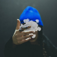 a silhouette effect around the subject. There's also some smoke or vapor coming from the hand, suggesting that the person might be smoking.