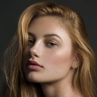 a fair complexion and appears to be wearing makeup that highlights her features, such as the contouring of her cheekbones and the shading around her eyes. Her expression is neutral, and she is looking directly at the camera. The background is plain and does not provide any additional context about the setting.