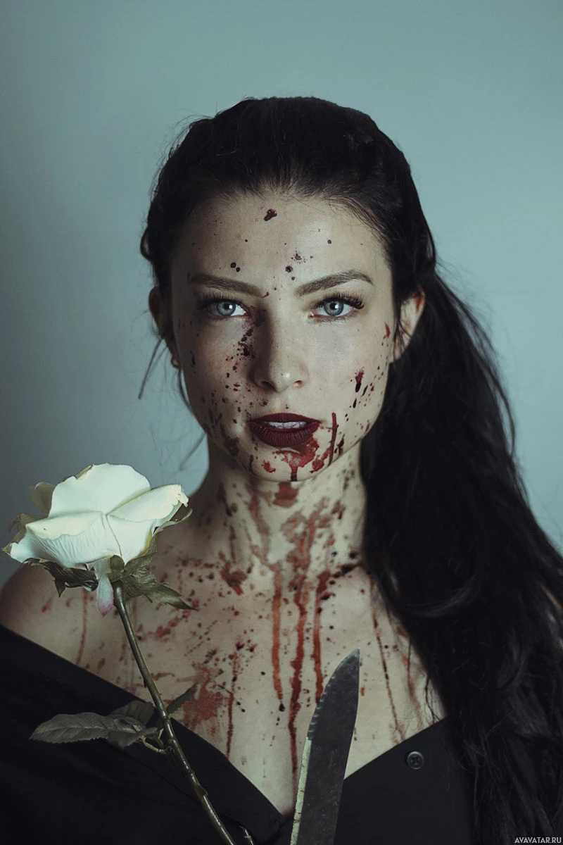 blue eyes. She appears to be in an emotionally intense or dramatic state, given the blood on her cheek, suggesting she may have been injured or involved in some form of altercation. She is holding a single white rose in one hand and there are bloodstains on both her hands and chest. Her attire is somewhat formal yet simple, with no visible logos or branding. The background is neutral, allowing the focus to remain on her expression and the dramatic elements present in the scene.