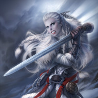 armor pieces that are reminiscent of Norse or Celtic designs, such as those found on the warriors in historical accounts. In her right hand, she holds a sword pointing downwards towards the ground. The background is dark and atmospheric, with clouds suggesting an impending battle or