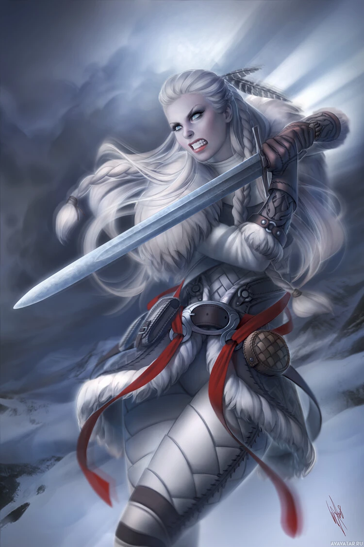 blonde hair and is wearing a helmet with horns, giving her an intimidating appearance. Her attire includes