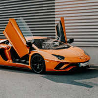 The image shows a bright orange Lamborghini sports car, which is an Italian brand known for its high-performance vehicles. The car's door is open, revealing the interior. It appears to be parked in a location with industrial buildings or a wall in the background.