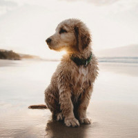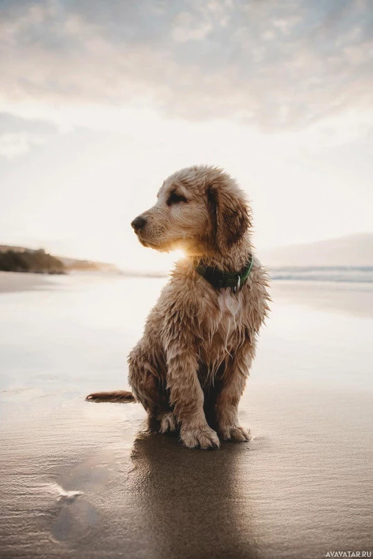 a golden retriever or a similar breed, looking out towards the horizon. The beach setting suggests it could be a calm and