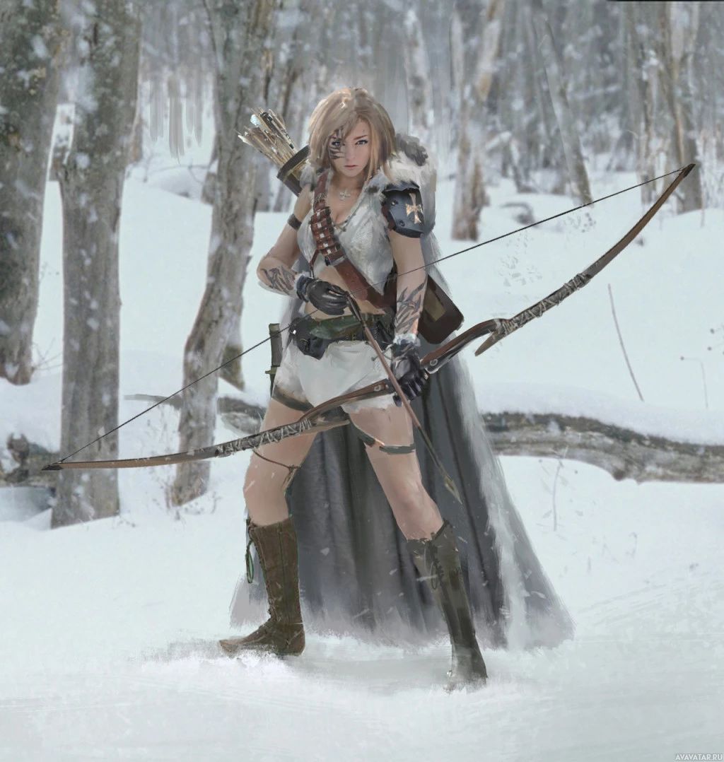 a female character, who appears to be a huntress or warrior from a fantasy setting. She is dressed in winter attire suitable for