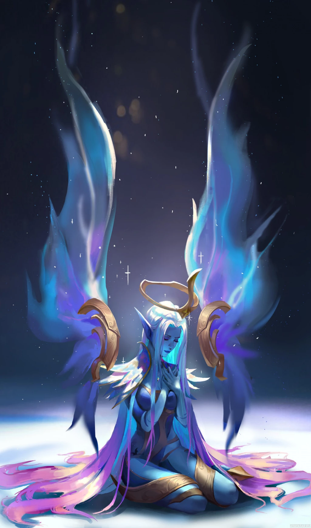 intricate designs. The background is dark and star-filled, which gives the impression of