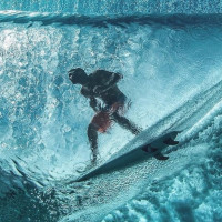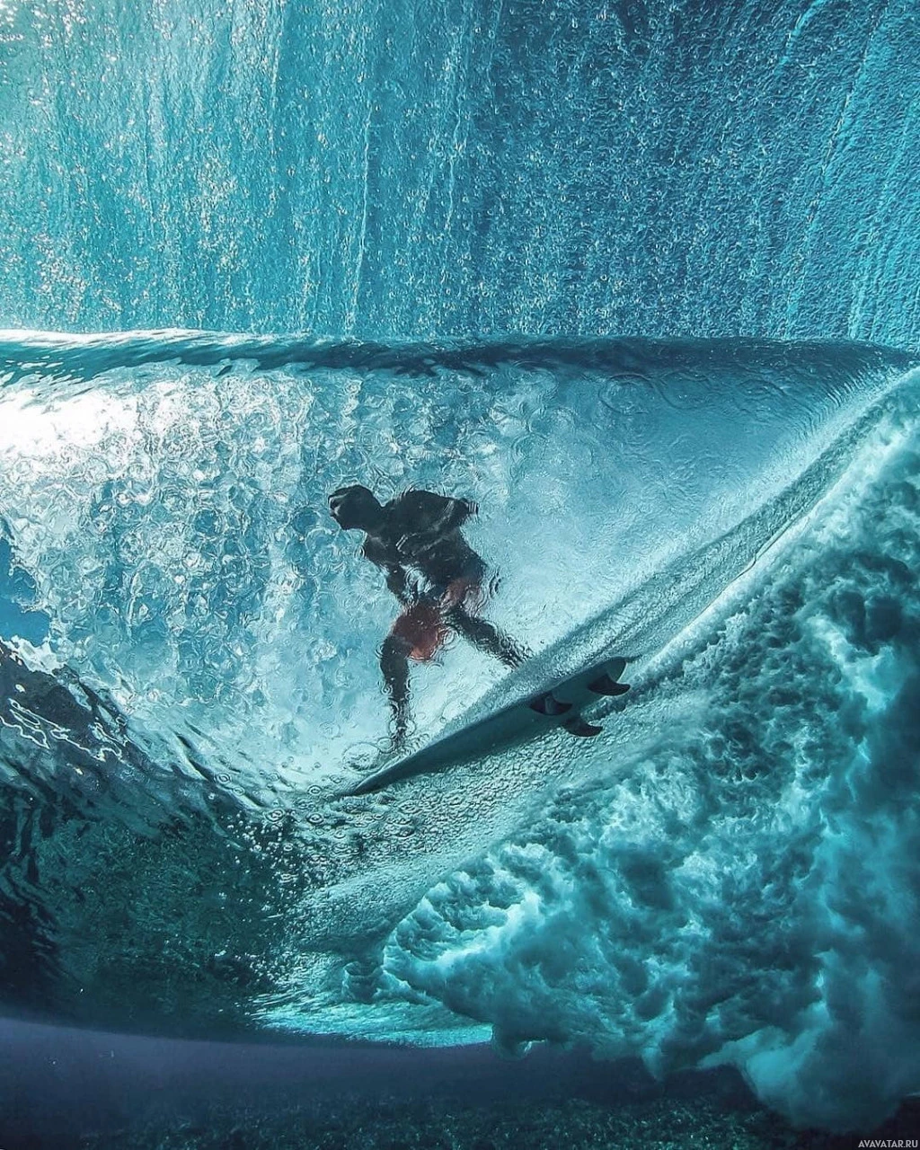 known activity called "surfing," which involves riding waves on a surfboard. In this image, the surfer appears to be at the peak of a wave, skillfully navigating the crest while maintaining balance and control. The water looks very clear, suggesting good